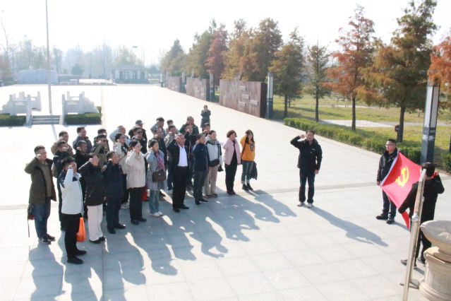 随后,党员队伍辗转前往新沂淮海战役十人桥纪念馆,继续追寻红色记忆。在十人桥纪念碑前全体党员整齐列队,佩戴党徽,神情肃穆。土木工程学院党委向纪念碑敬献花圈,寄托着对英雄烈士的深切哀思与崇高敬意。全体党员面向党旗,庄严重温入党誓词,表达对革命先烈的告慰。接着,党员们参观了淮海战役十人桥纪念馆,认真聆听了淮海战役期间解放军战士的英勇事迹,每一位党员再次接受了深刻的党性教育。